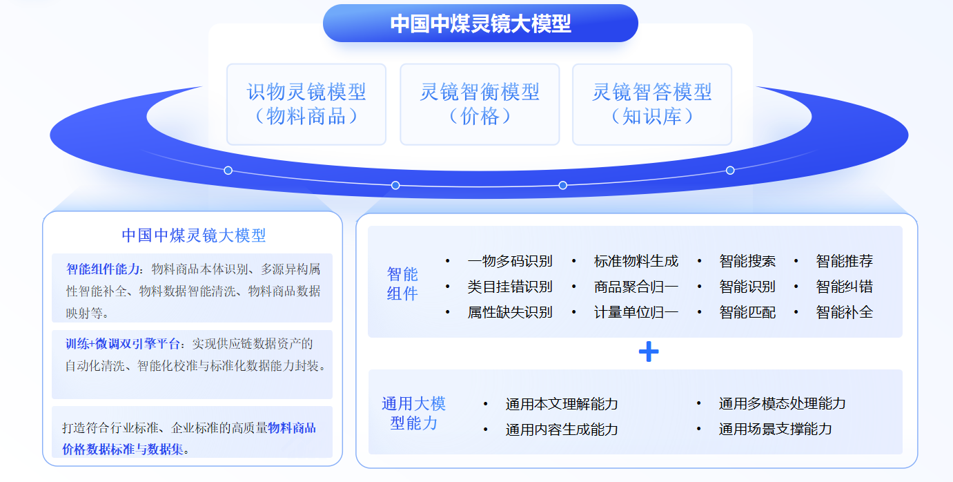在數字中國戰略的引領下,中國中煤大力建設智控管理體系。通過建設數智供應鏈,促進提升全要素生產率,逐步形成采購域新質生產力。“中煤靈鏡供應鏈大模型”是智控采購域項目關鍵創新成果之一,包括“識物靈鏡”“靈鏡智衡”“靈鏡智答”三大模型。